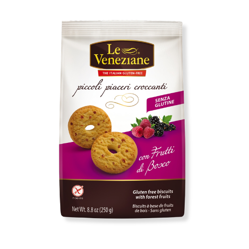 Farinha de milho 33%, farinha de arroz, açúcar, xarope de glicose, óleo de sementes de girassol, manteiga, frutos do bosque 4% (puré de maçã 14%, sumo de groselha 6%, amora 5%, morango 4%, framboesa 4%, açúcar, xarope de frutose, farinha de arroz, manteiga de cacau, gelificante: pectina, acidificante: ácido cítrico, aromas naturais), maltodextrina, fibra vegetal , fibra alimenta: inulina, levedantes: carbonato de amónia, bicarbonato de sódio, difosfato, sal, aroma, emulsionante: lecitina de girassol.