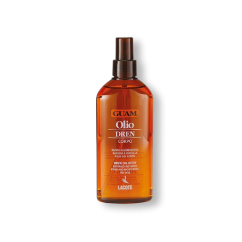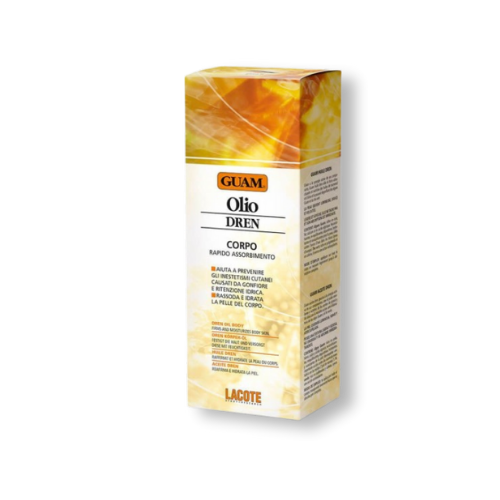 Produto cosmético. Óleo de corpo drenante. Leve e suave, não deixa a pele gordurosa e é absorvido imediatamente. Graças à sinergia ativa dos seus componentes, conjuga a força amaciadora e nutritiva dos óleos de girassol e azeitona com o elevado poder descongestionante das algas Guam® e do chá verde.